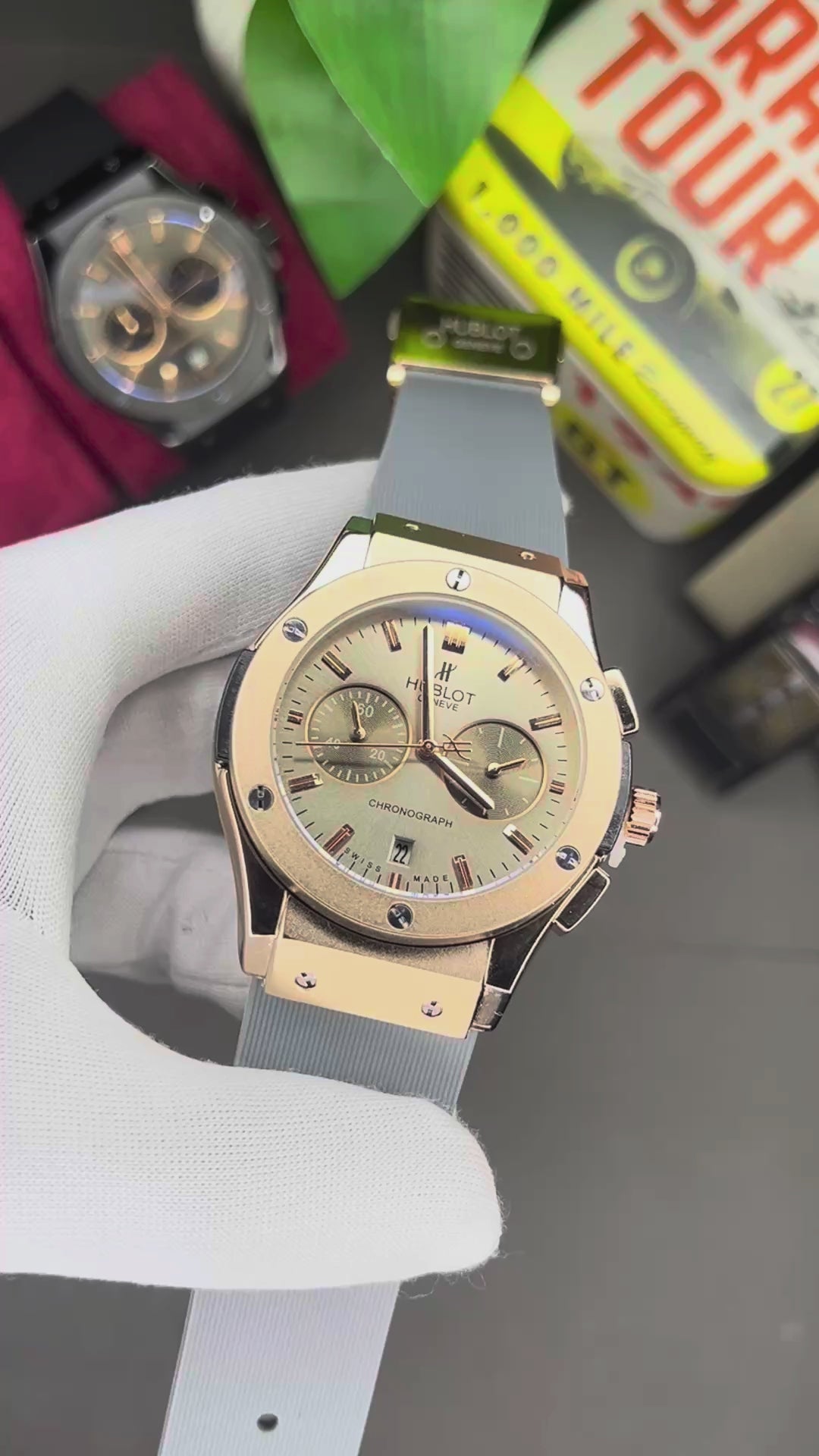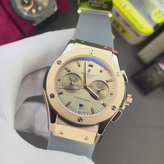 This Hublot Classic Fusion Chronograph combines a refined champagne-silver dial with a rose-gold case and soft grey strap, giving you a perfect balance of elegance, comfort, and everyday luxury.
