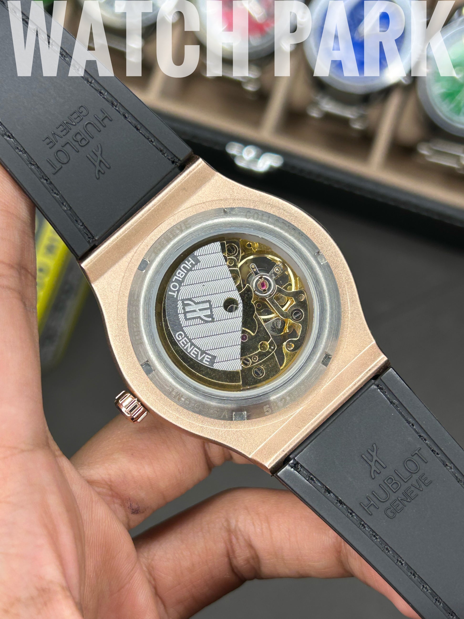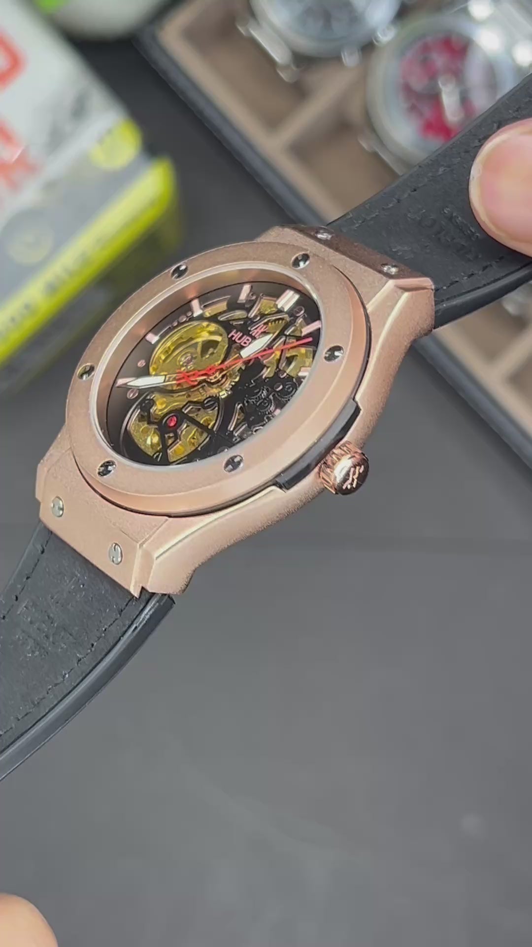 This watch is a bold fusion of luxury and industrial design. Its skeletonized dial reveals the intricate mechanical heart, while the rose gold finish offers a sophisticated, modern aesthetic for enthusiasts.