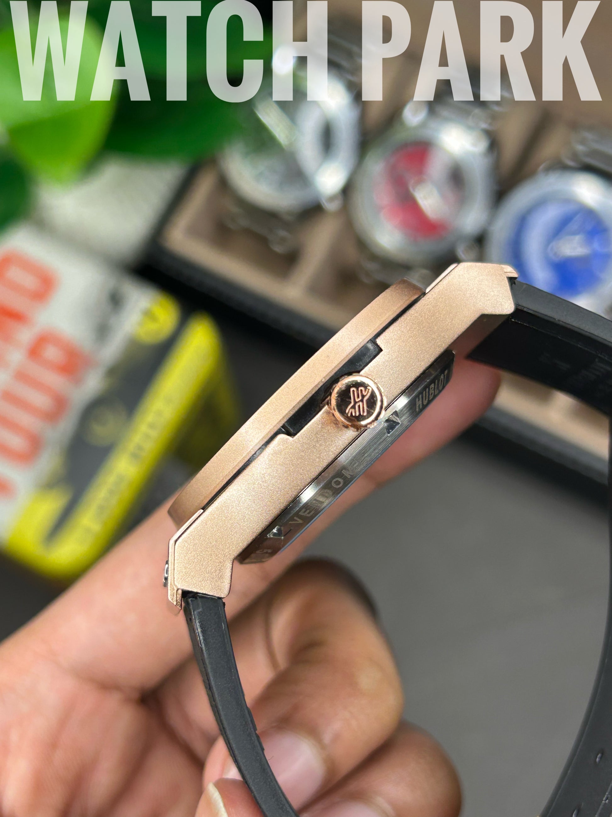 Strap: Durable black rubber strap with embossed Hublot branding.