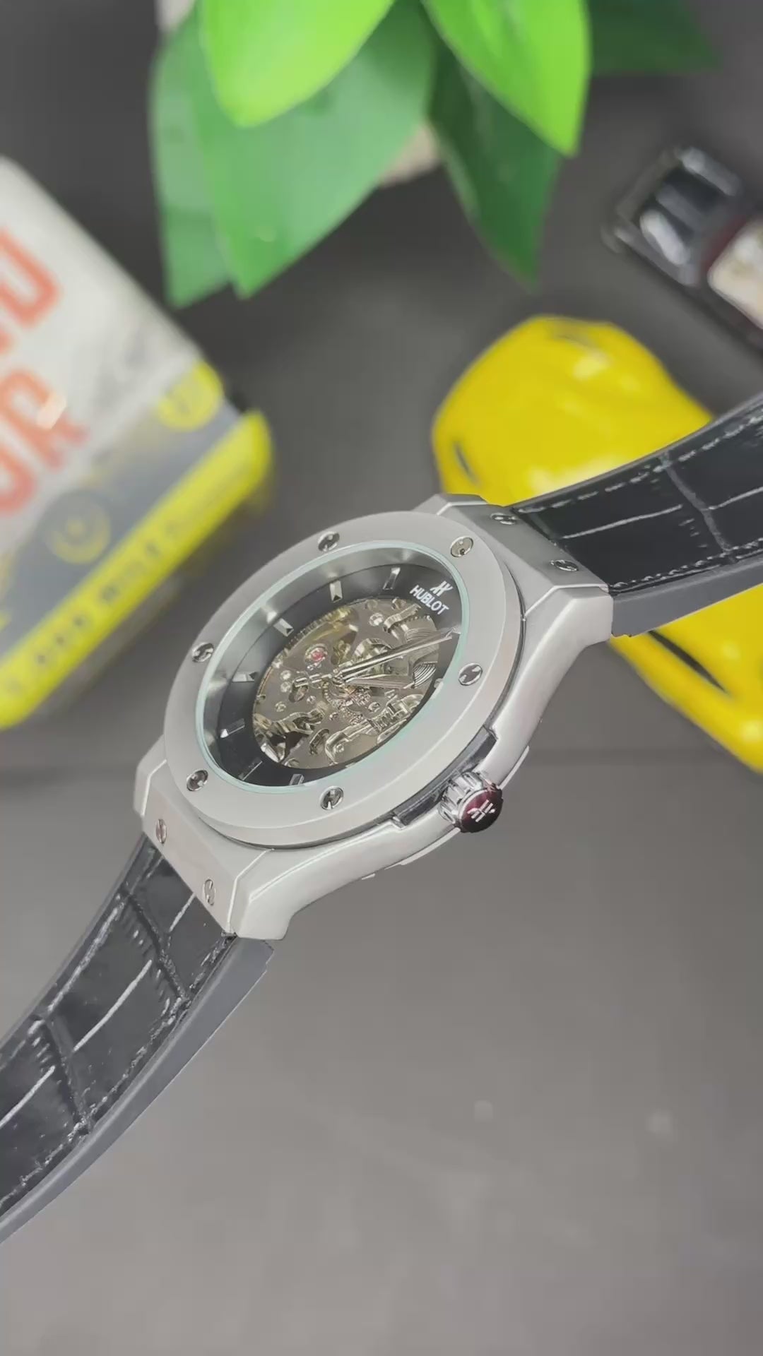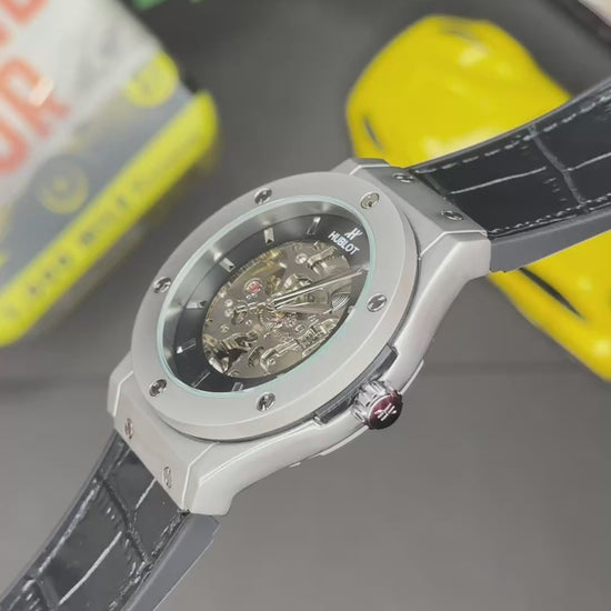 The Hublot Classic Fusion Skeleton blends industrial "Art of Fusion" with elegant design. Its transparent dial showcases the intricate inner workings, offering a modern, luxury aesthetic for those who appreciate mechanical artistry.
