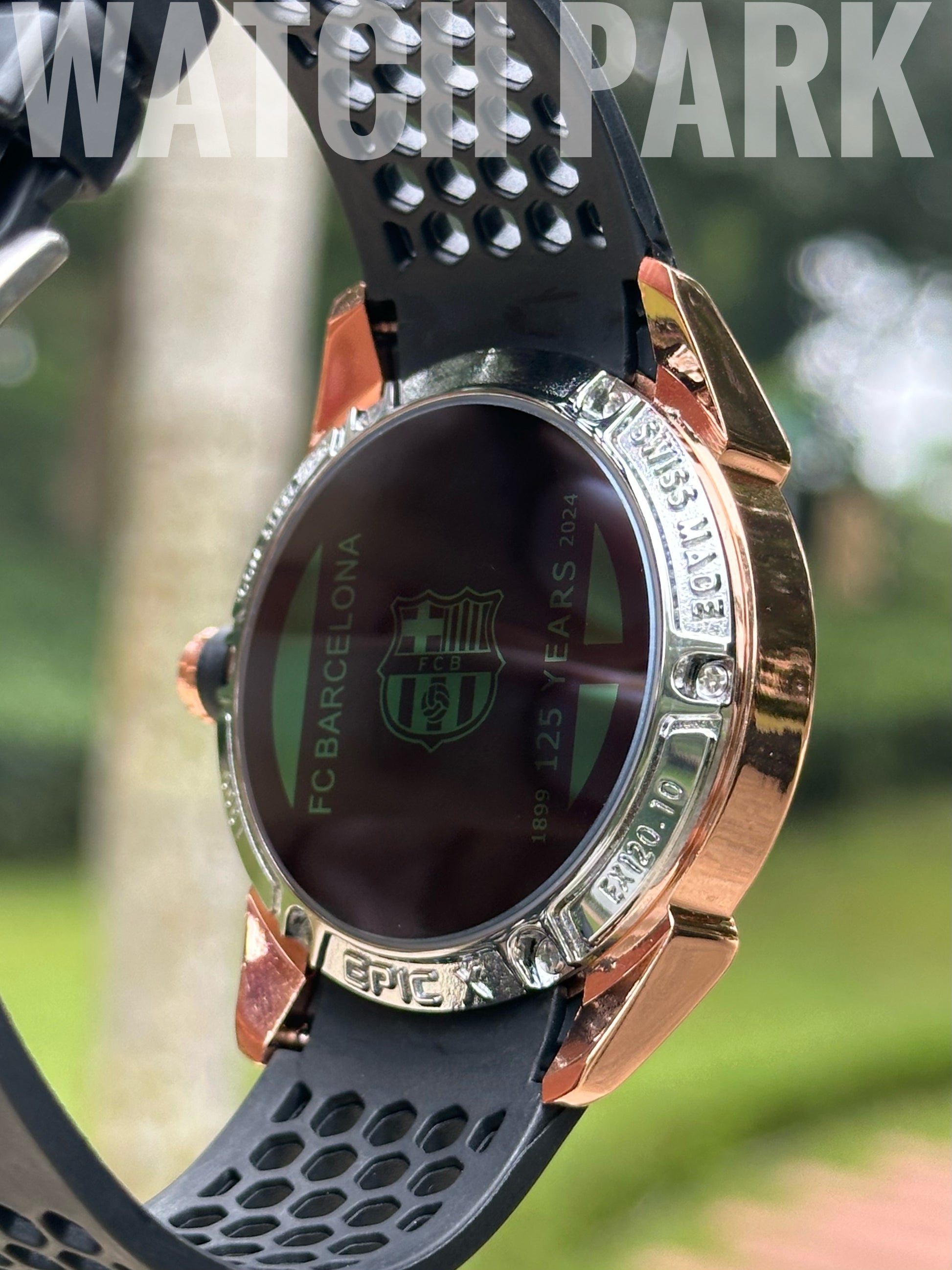 Case Back: Smoked sapphire crystal with the Barca logo and anniversary dates (1899–2024).