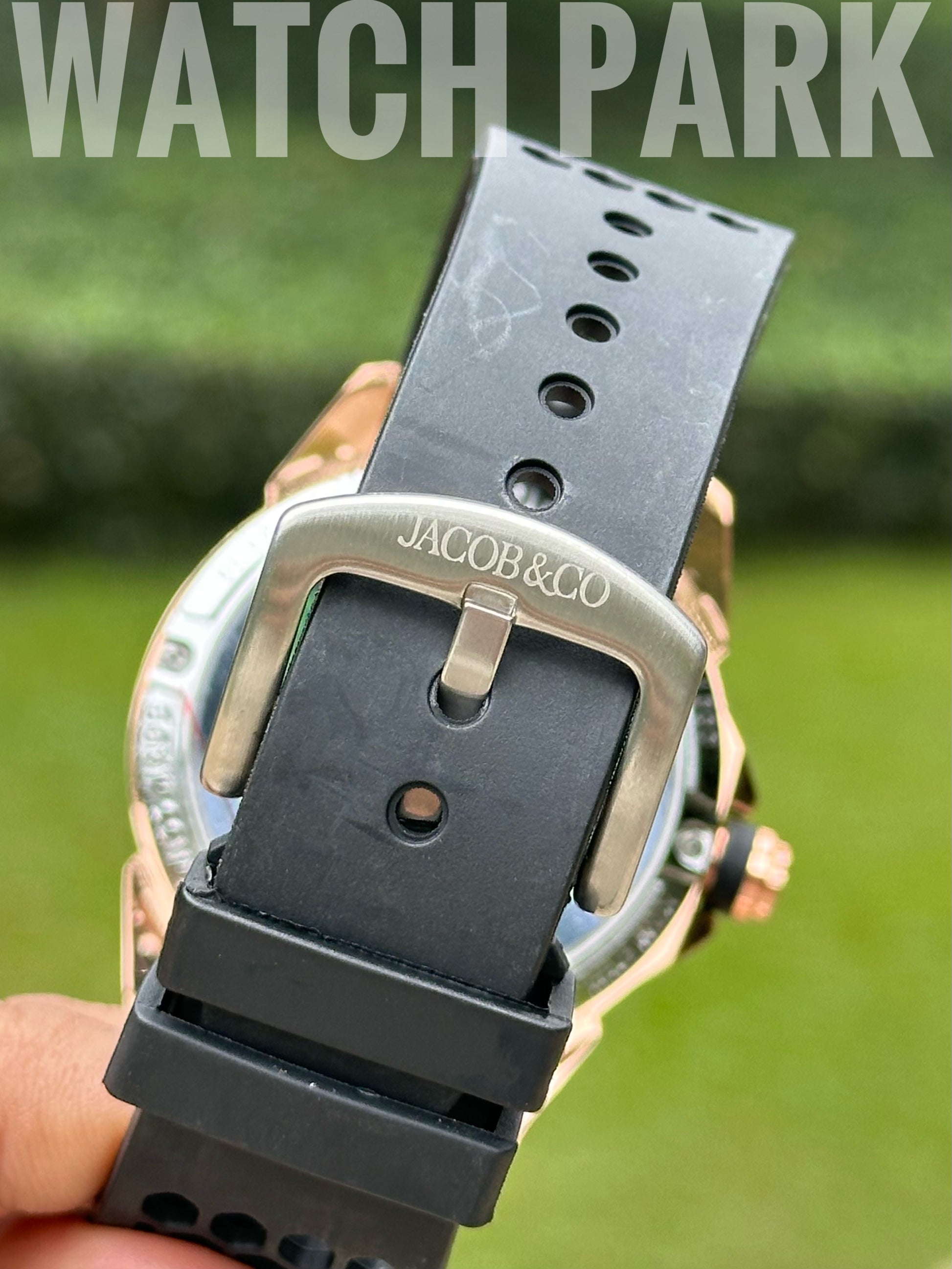 Clasp: Tang buckle engraved with the "Jacob & Co" logo.