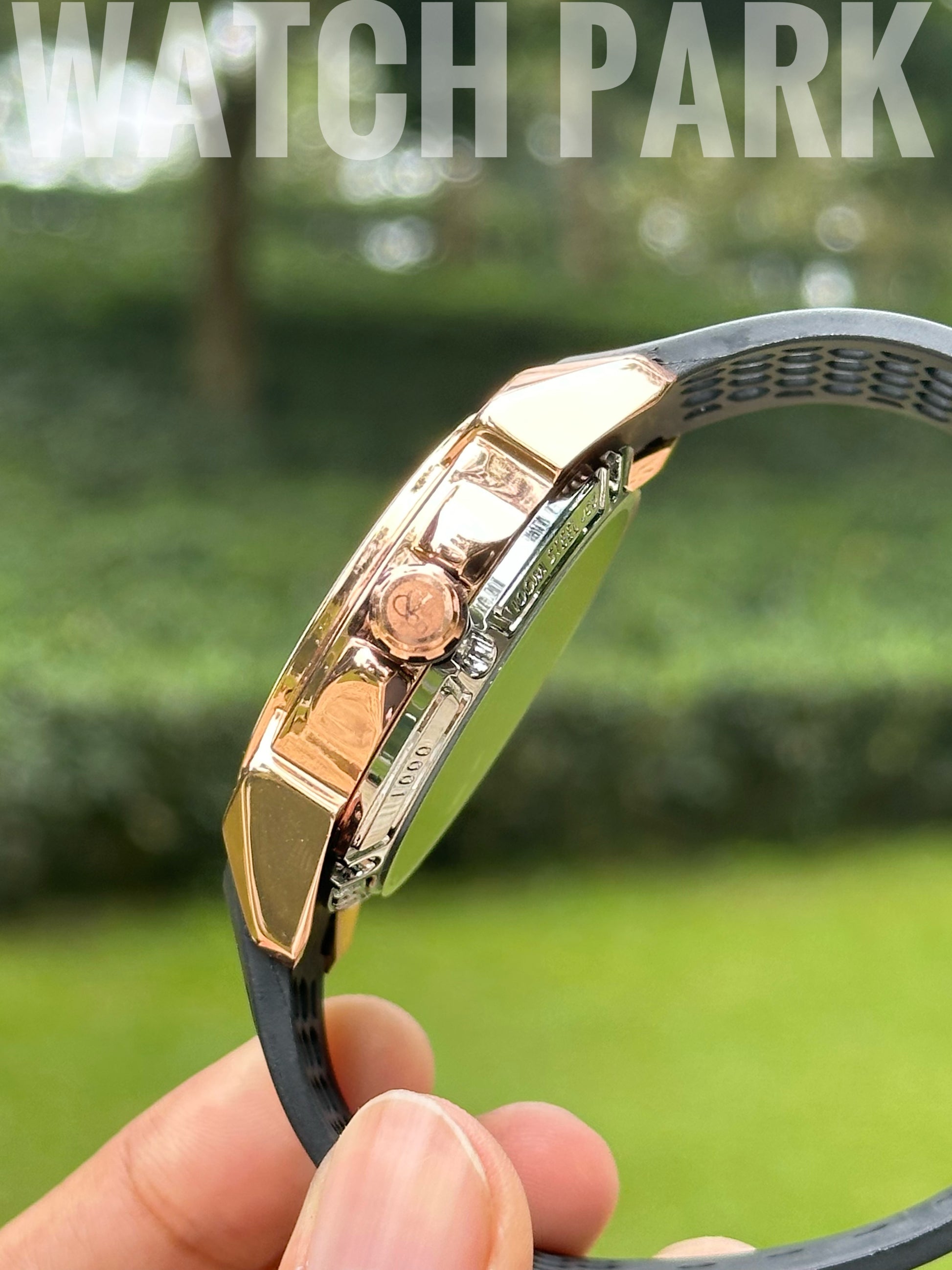 Case Material: Rose gold-finished stainless steel with polished "X" lugs.