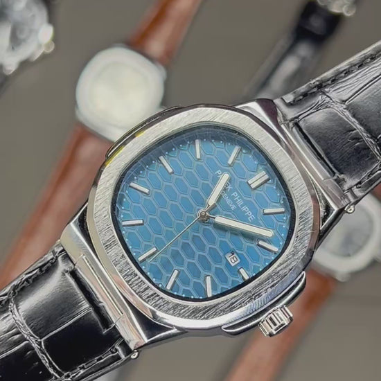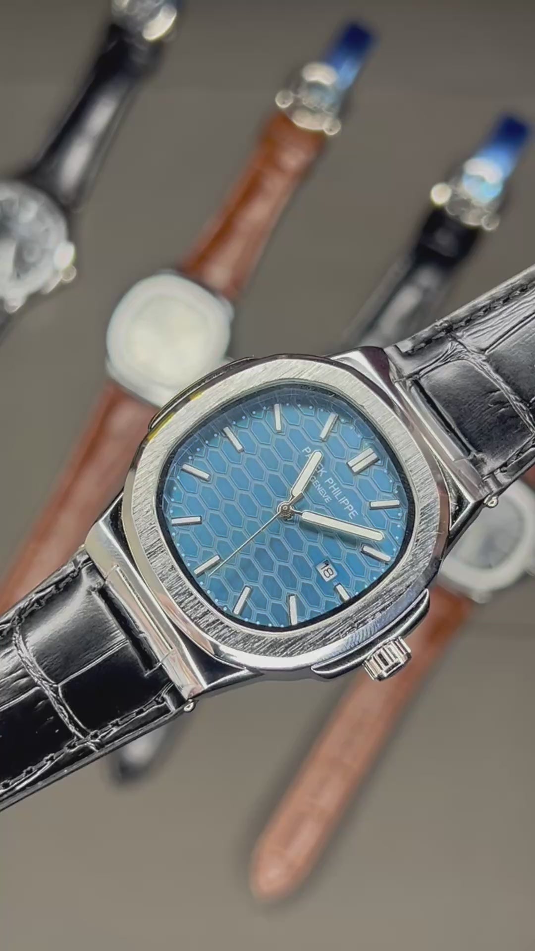 This is the most vibrant of the watches, featuring a striking blue honeycomb dial that makes a bold statement. The unique color combines with the iconic octagonal case and is paired with a sleek black leather strap, giving it a luxurious and sporty look.
