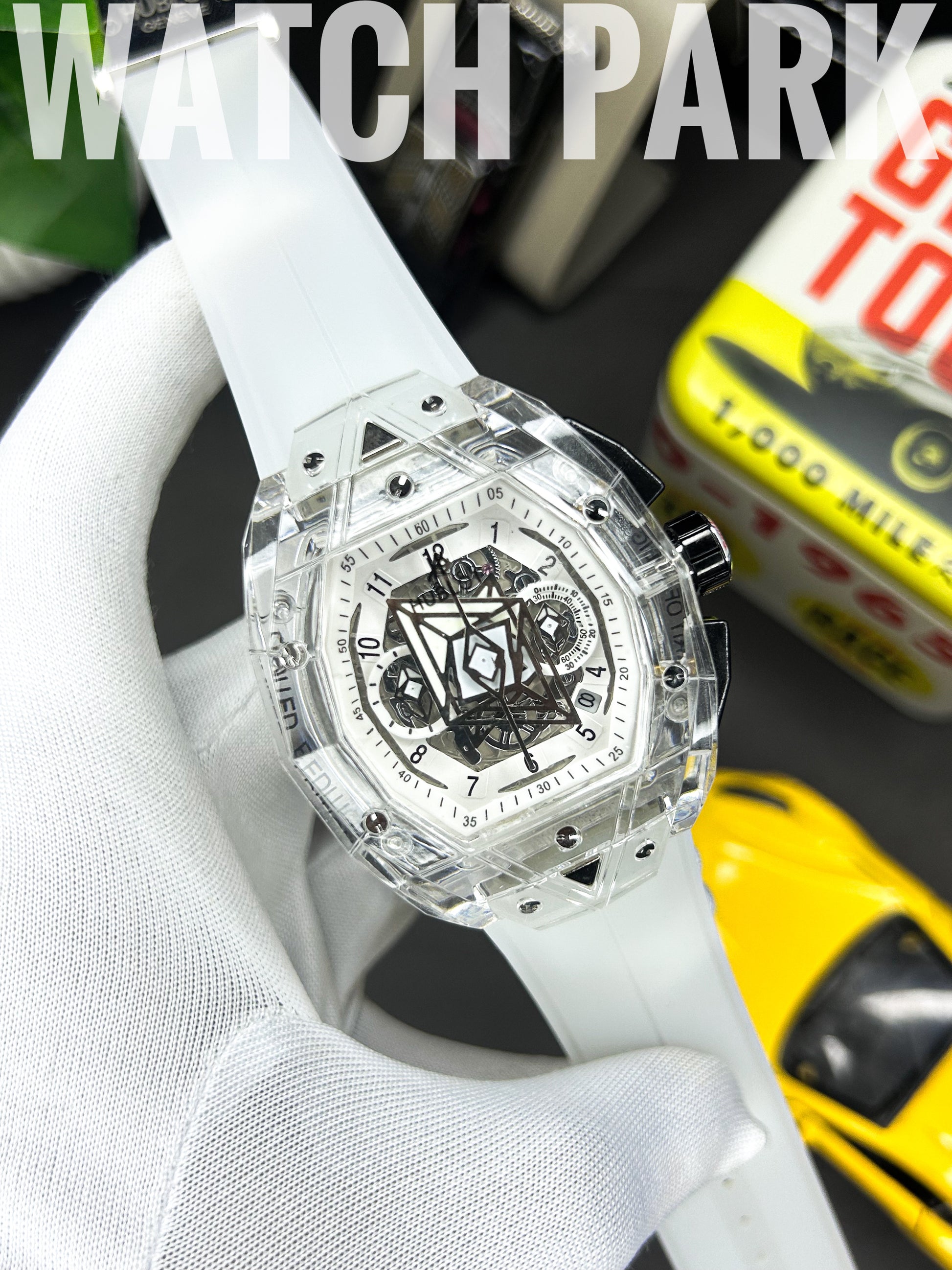 Witness timekeeping redefined. The Spirit of Big Bang Sapphire transforms the traditional watch case into a clear, resilient masterpiece, giving you an unprecedented, three-dimensional view of the powerful manufacture movement within. Machined from solid blocks of synthetic sapphire crystal—a material second only to diamond in hardness—this timepiece is a bold declaration of transparency, technical expertise, and absolute luxury.