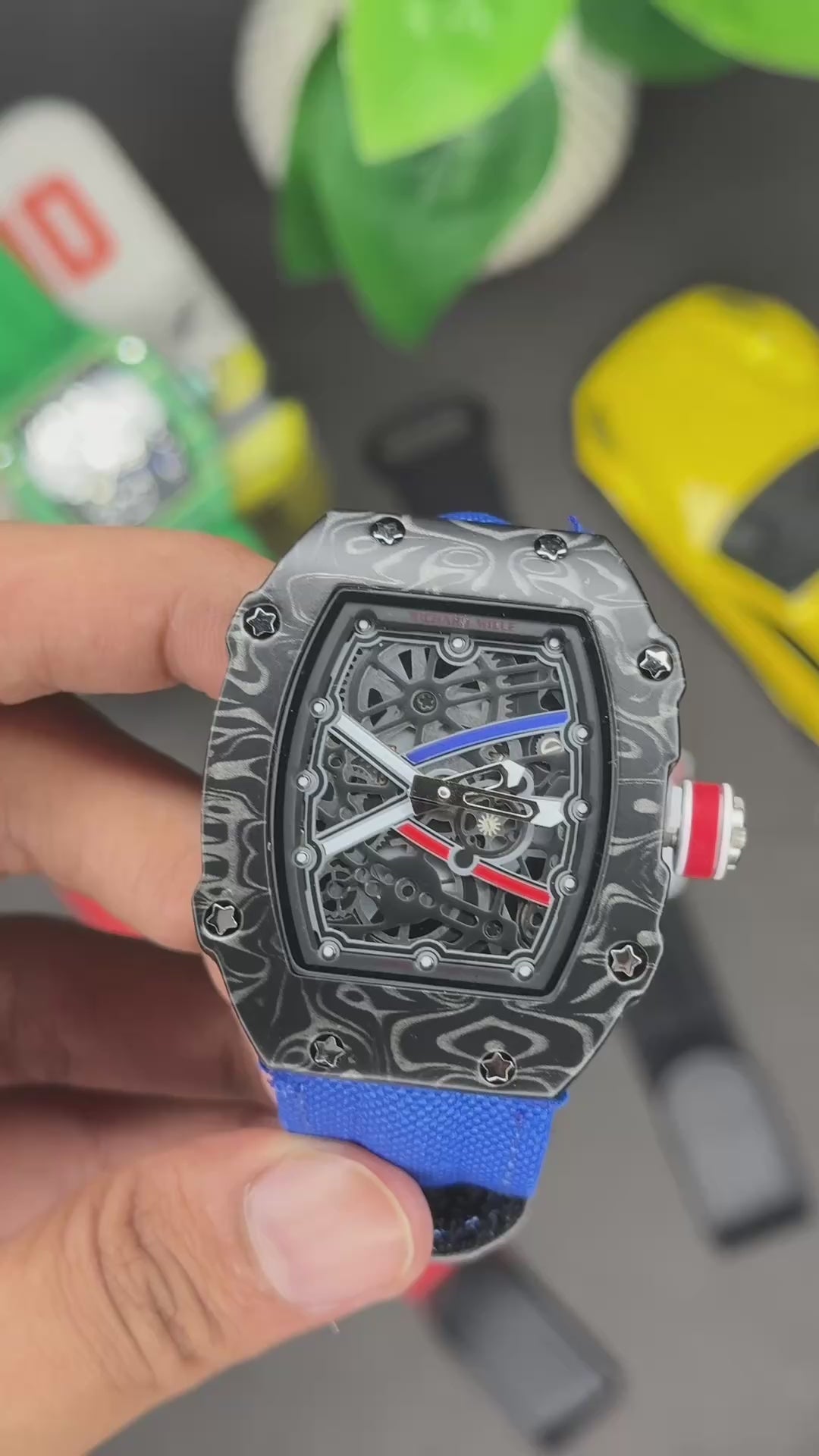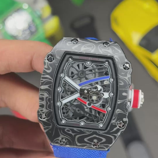 Dial Color: Skeletonized (transparent) with hand-painted bridge accents in blue and red.