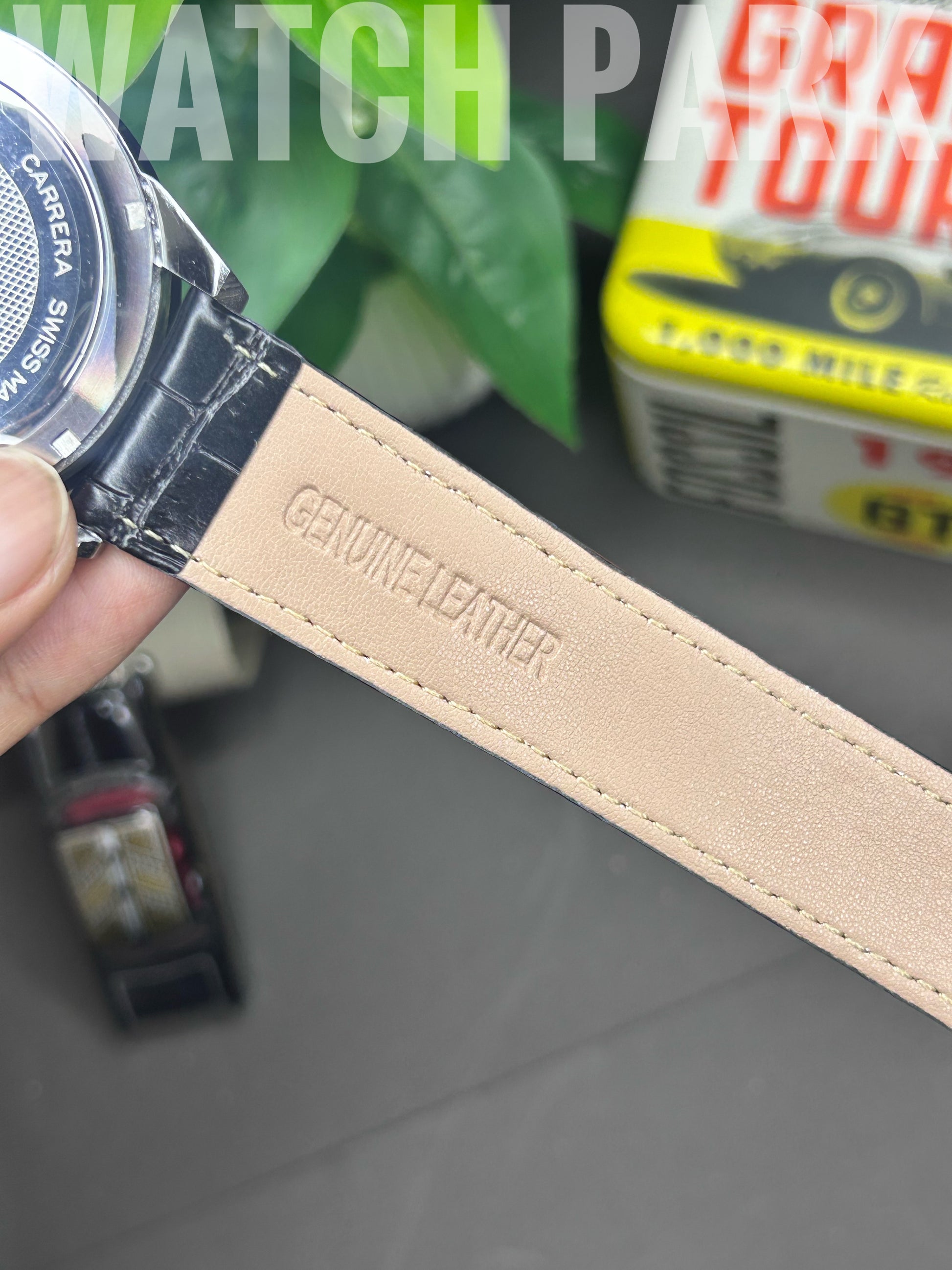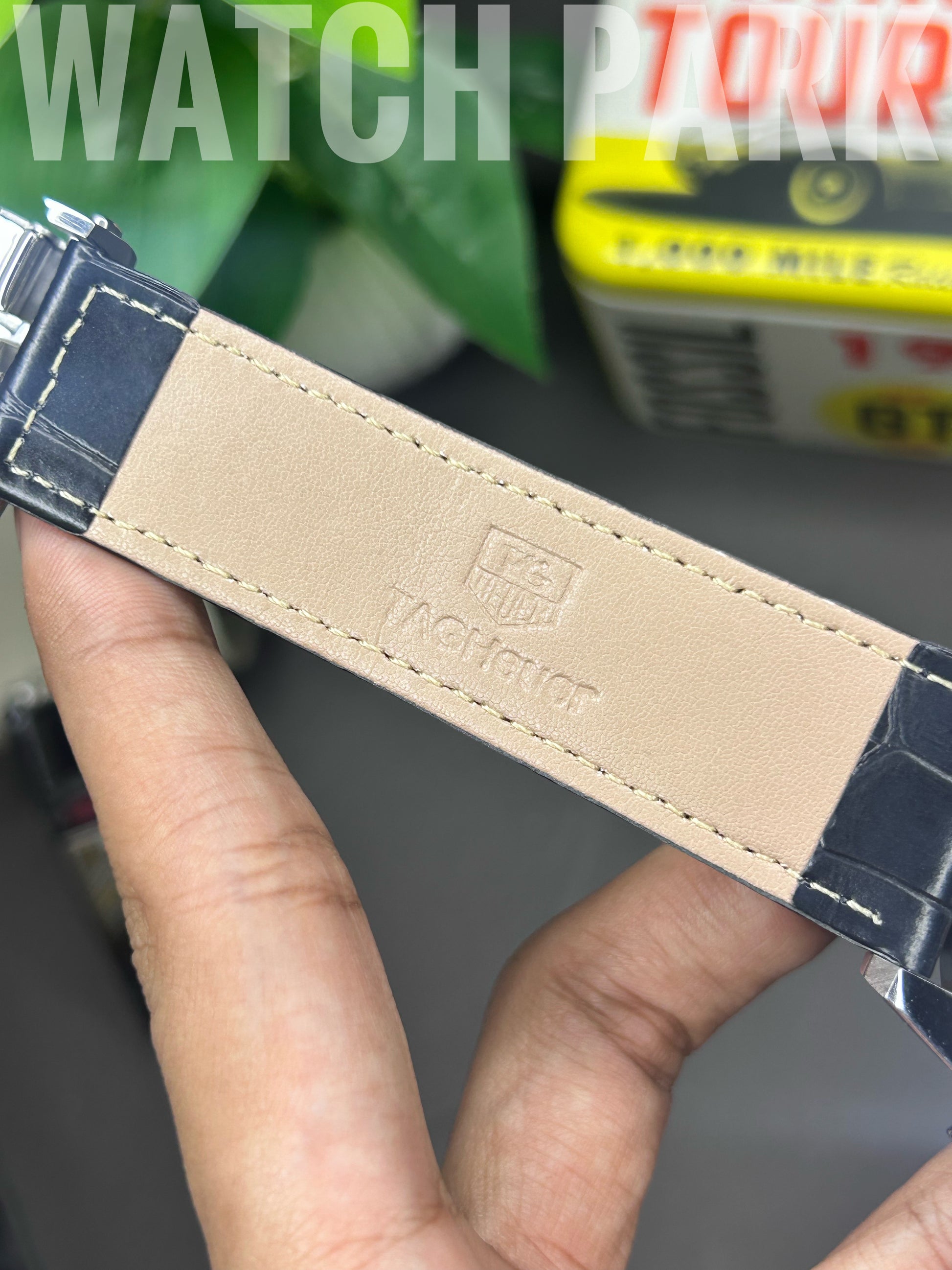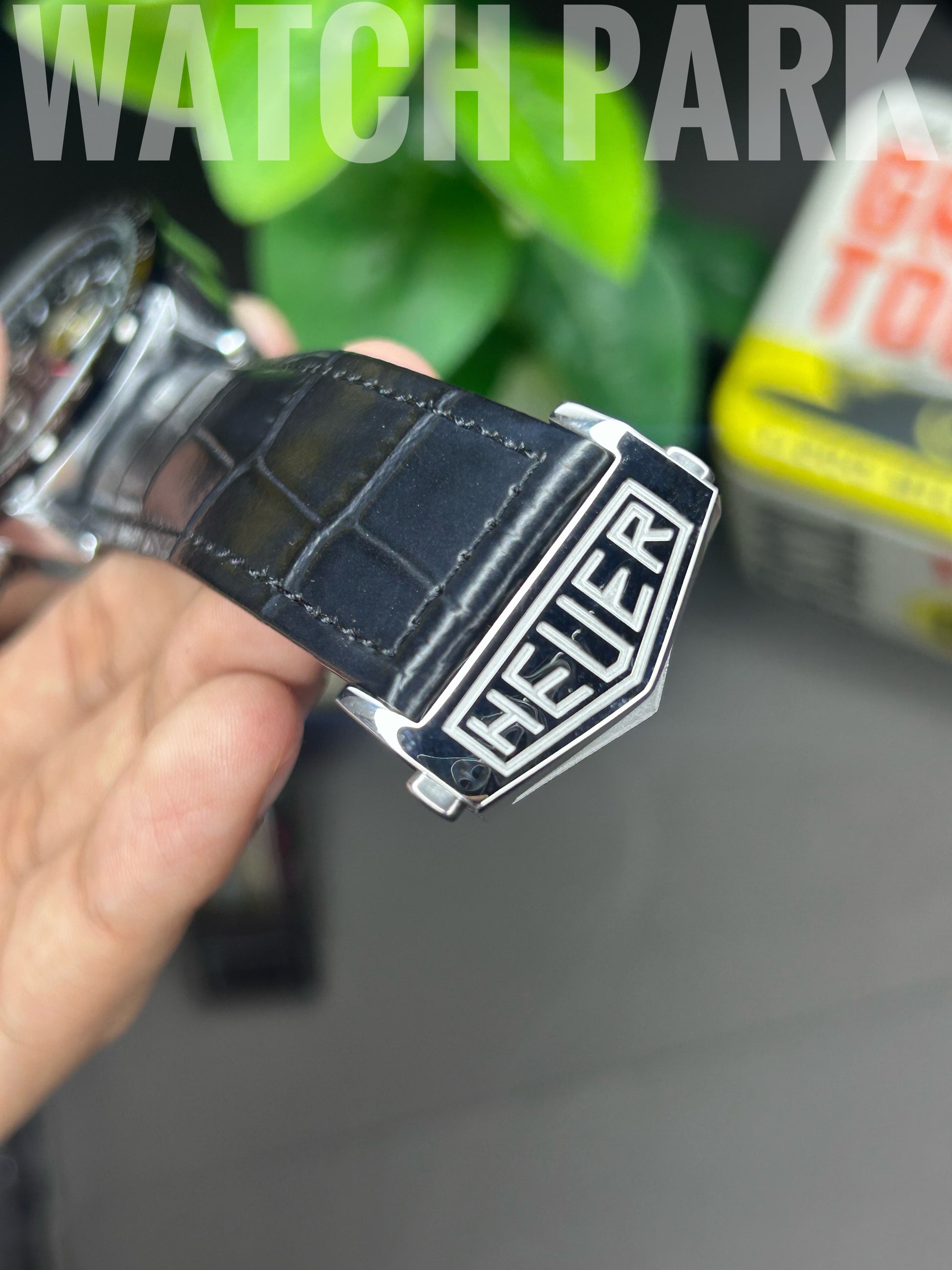 | Strap Material | Black genuine leather strap with an alligator grain and an engraved Heuer deployant clasp. |