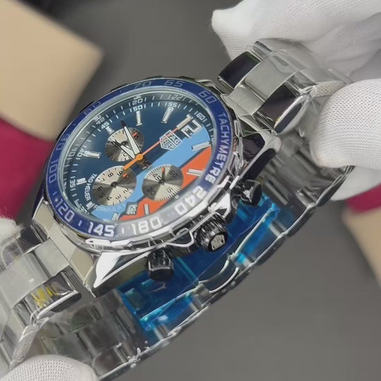 This is more than a timepiece; it is a wearable piece of motor racing history. The TAG Heuer Formula 1 Chronograph Gulf Special Edition celebrates the legendary partnership between TAG Heuer and Gulf, instantly recognizable by its vibrant blue, light blue, and orange racing stripes.