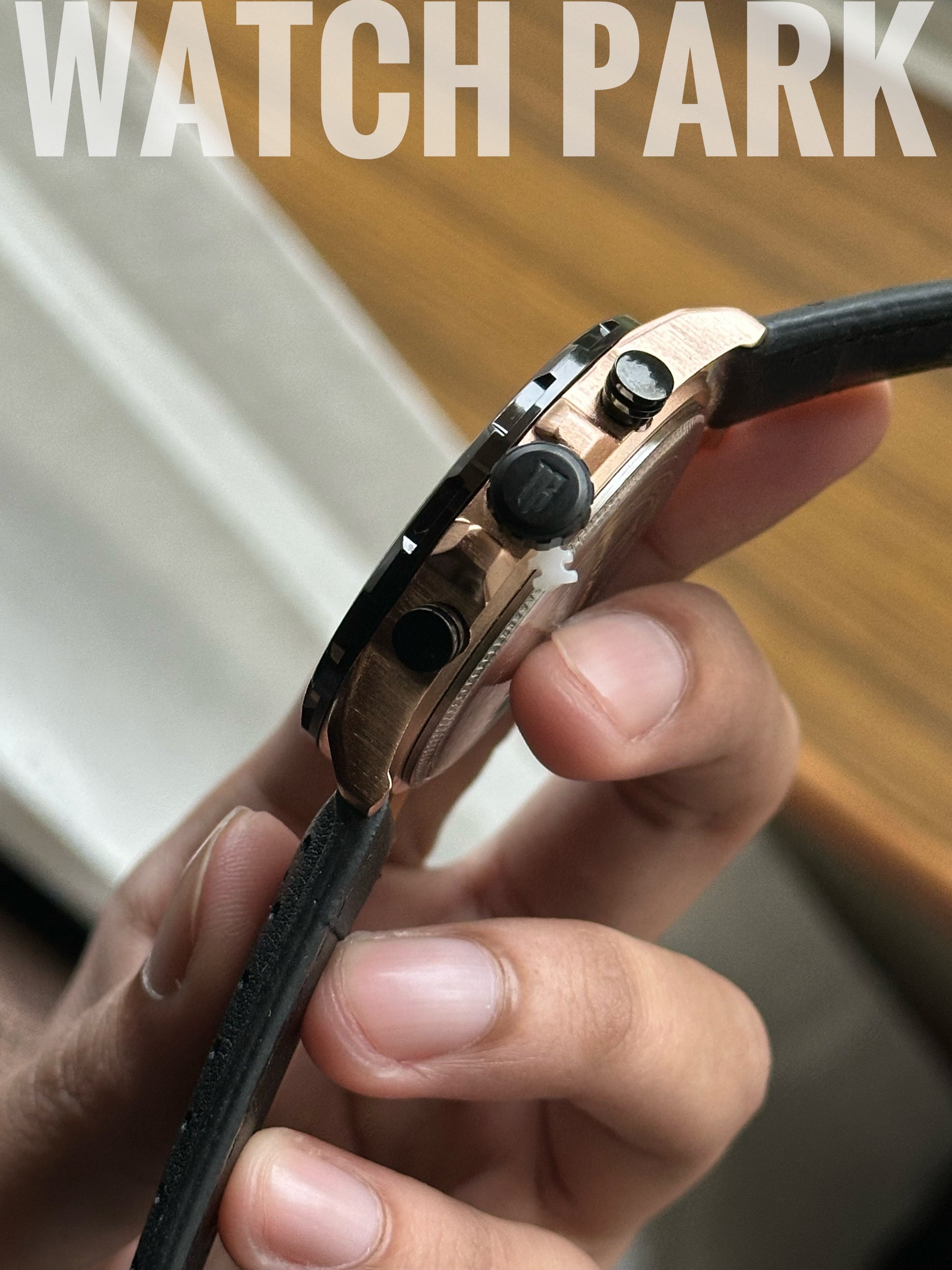 Case Material: Rose gold-tone metal with a black tachymeter bezel
