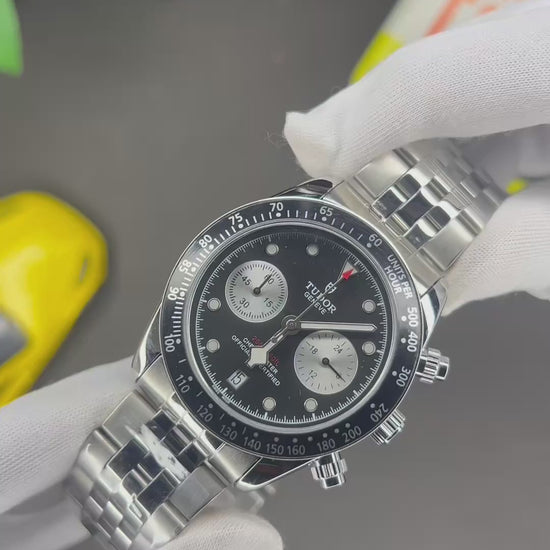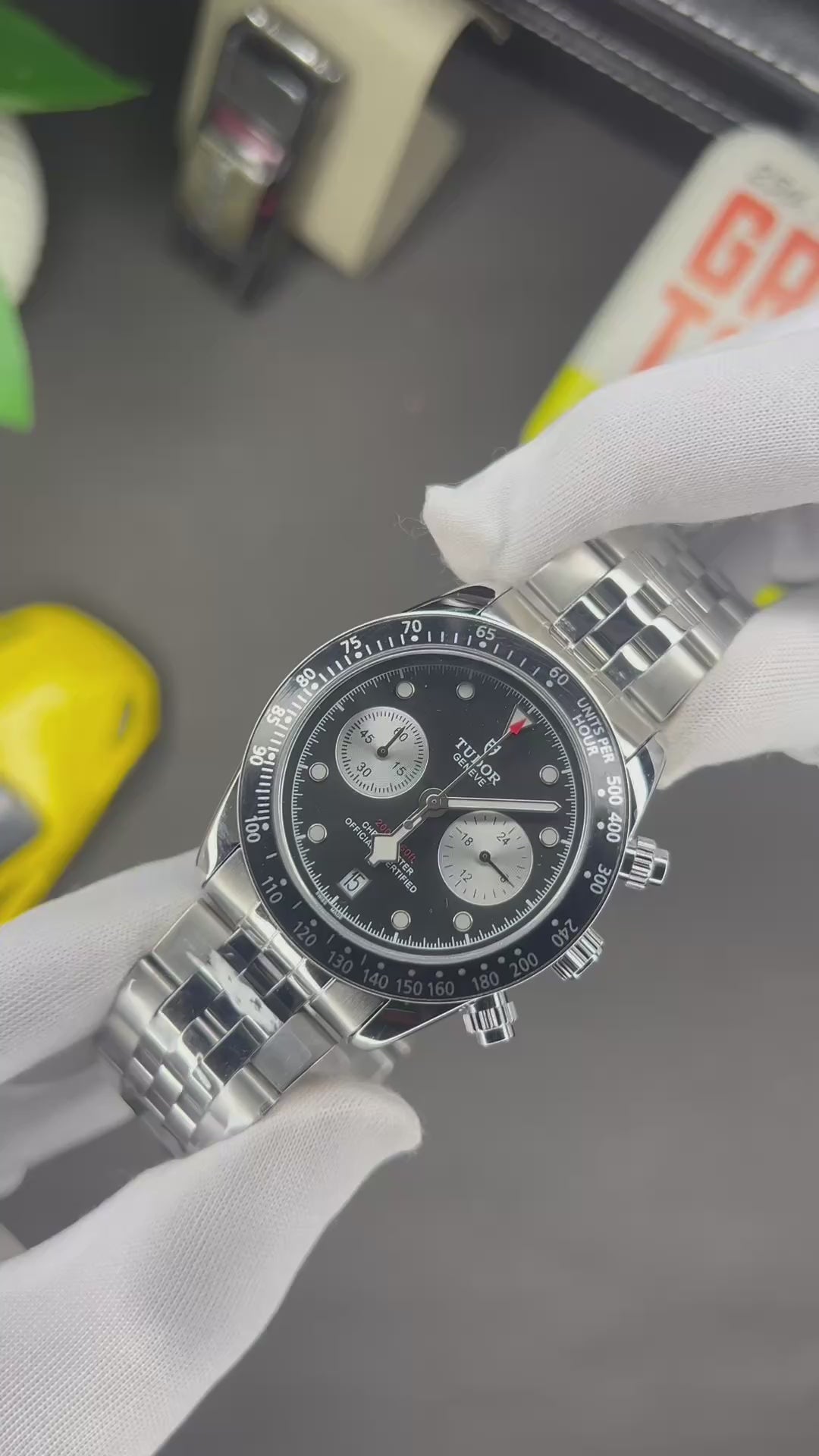 This model is the classic, high-contrast "Reverse Panda" chronograph from Tudor, blending the brand's iconic diving watch elements with a vintage motorsport aesthetic. It is a highly legible and powerful timepiece built for precision.